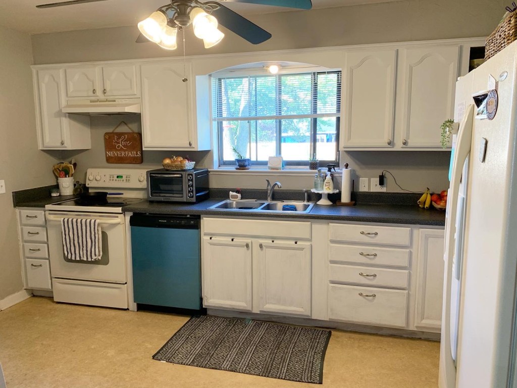 I absolutely love how bright and airy our kitchen feels with just some white paint on the cabinets! It’s been forever since I started this project and honestly it still isn’t quite done.