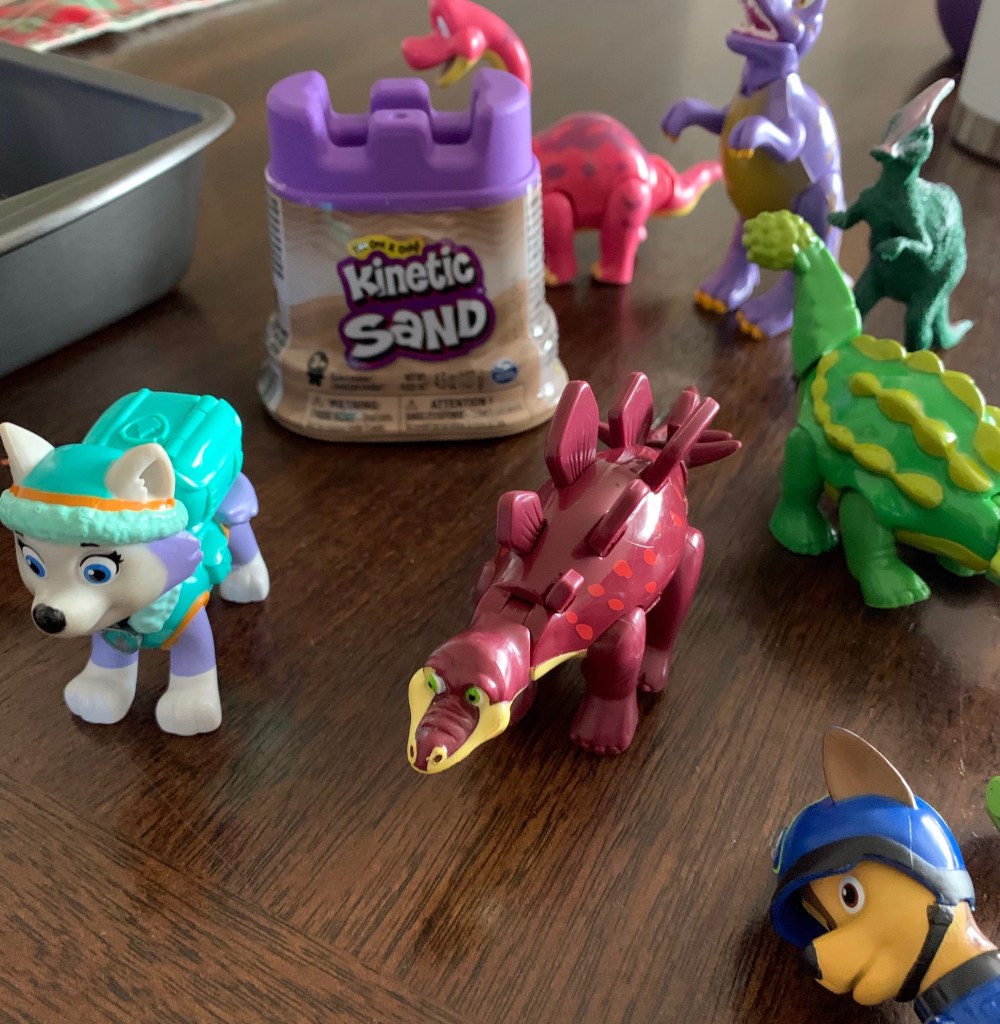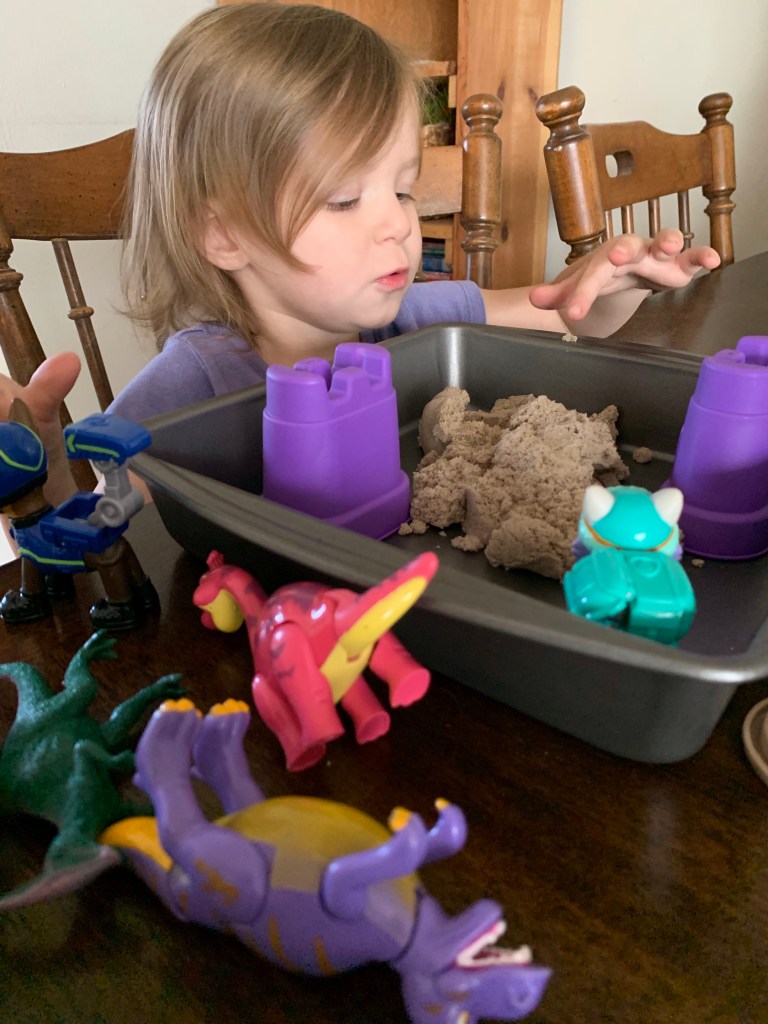 Kids love sensory activities. At least mine do! So yesterday morning when we needed some entertainment (or distraction so mom can make lunch) I busted out our kinetic sand and some animals. (This post is not sponsored…just an honest review from a happy momma!)