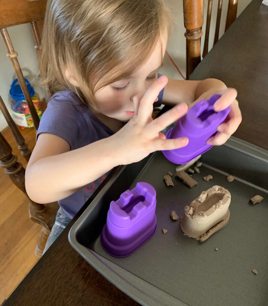 To say that Addie was excited was an understatement. She played with it again last night and has asked for her sand already this morning. What I really love about kinetic sand is how easy it is to clean compared to regular sand! I am all about activities that she can play independently and I don’t have to stress out over. (Not the case with us and Playdoh just FYI.) As with anything else, close supervision is required to ensure your child’s safety.
