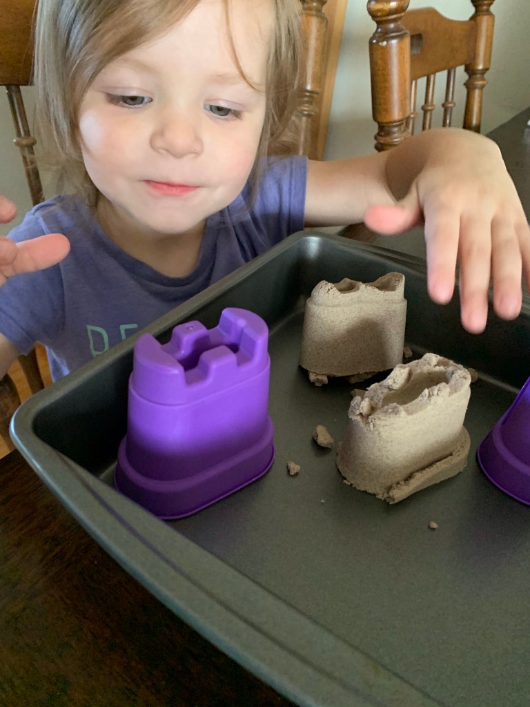 She loved burying one of the Paw Patrol pups and using the other to rescue them by digging them back out. Using the little sand castle mold was also a hit and perfect for the pups to squish while Addie giggled along. This activity kept her attention for over an hour y’all!