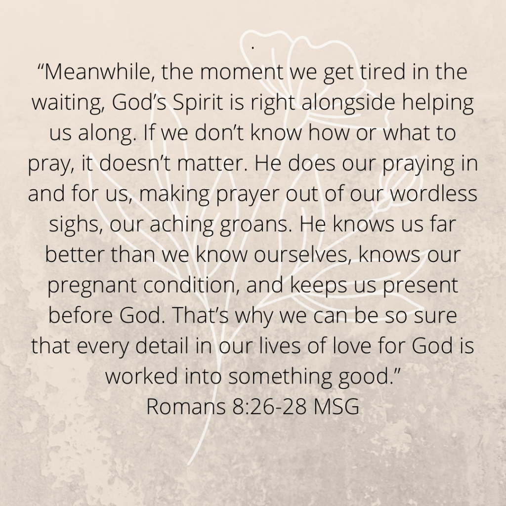 “Meanwhile, the moment we get tired in the waiting, God’s Spirit is right alongside helping us along. If we don’t know how or what to pray, it doesn’t matter. He does our praying in and for us, making prayer out of our wordless sighs, our aching groans. He knows us far better than we know ourselves, knows our pregnant condition, and keeps us present before God. That’s why we can be so sure that every detail in our lives of love for God is worked into something good.” Romans 8:26-28 MSG