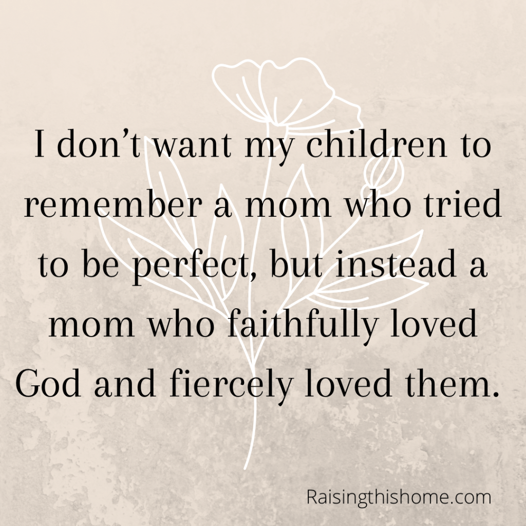 Let my children see you Lord. Let my motherhood be a reflection of your goodness and glory and your love for them. Help me to admit when I am wrong to them and to always be honest with them and lead them by example. I don’t want them to remember a mom who tried to be perfect, but instead a mom who faithfully loved God and fiercely loved them. Amen.”