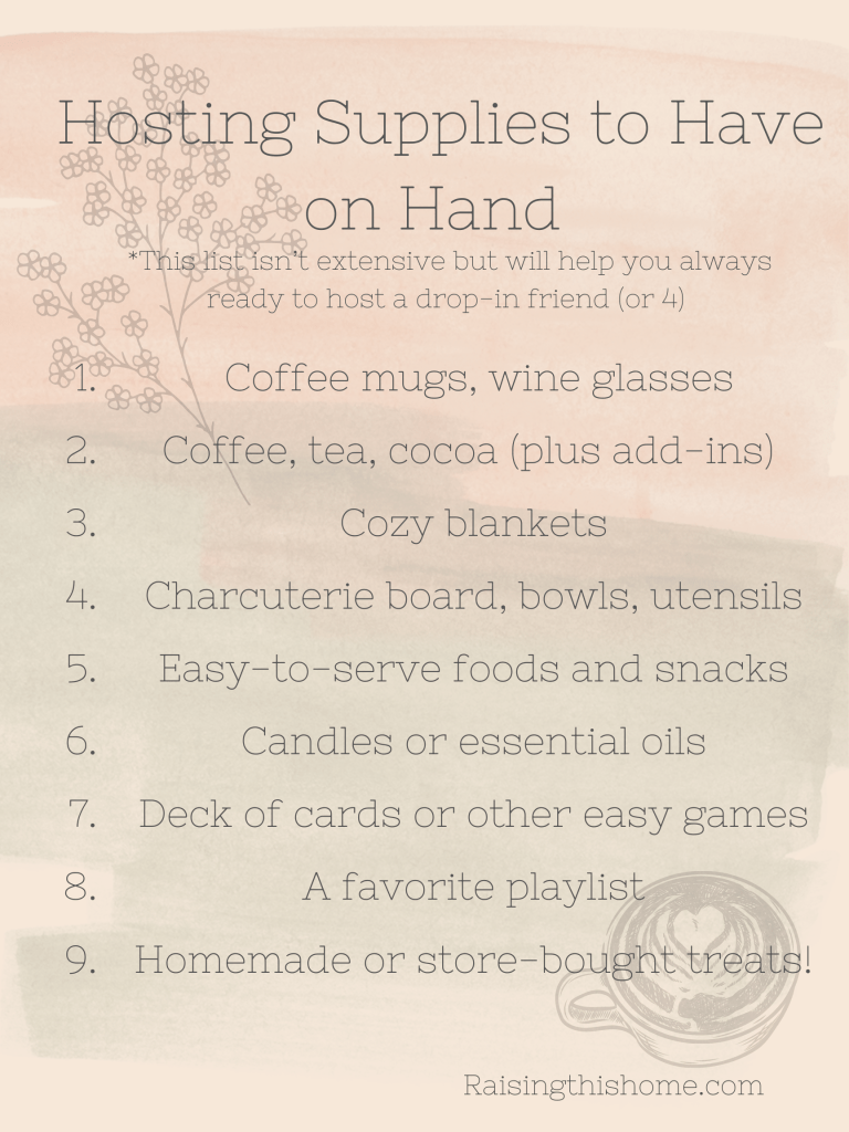- Do you own enough coffee mugs for an impromptu get-together? They can be solid white, mis-matched, whatever brings you joy.