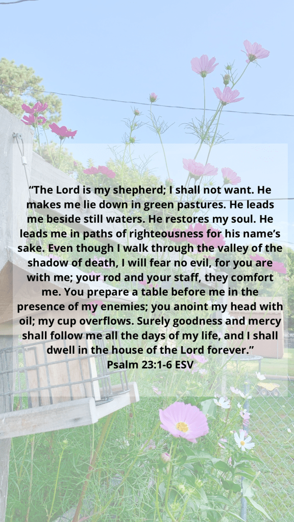 I have begun memorizing this psalm in an effort to remind my soul to sit still with God. No matter how uncomfortable or hard it is. Allow Him to comfort and restore my soul, trust that He is providing for me and protecting me even when I feel surrounded and exposed.